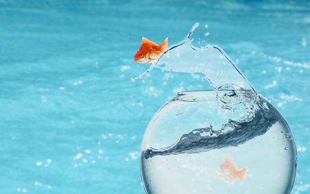 Goldfish jumping out of glass small bowl into bigger one against light blue background