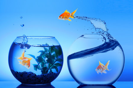 Goldfish jumping out of glass bowl into another one against blue background