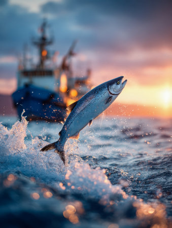 A shimmering silver fish bursts from vibrant waves as the sky ignites with sunset hues, with a distant fishing boat softly fading into the lively seascape.