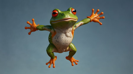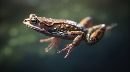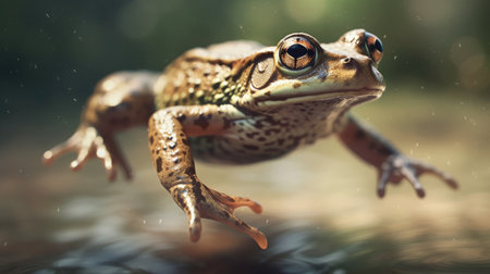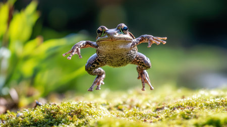 A stunning close-up image of a frog mid-leap, showcasing its unique features against a lush green background. This shot captures the essence of wildlife in motion.