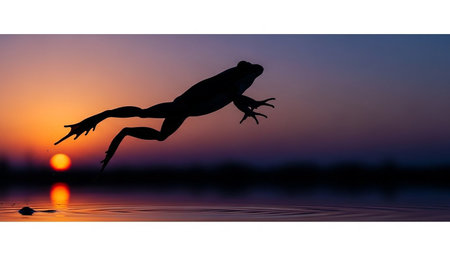 A frog silhouette leaps over rippling water during a vibrant sunset. Clear details and vibrant colors enhance ...