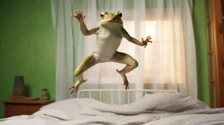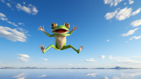 AI Generated. animated green frog in mid jump on a pastel green background with copy space