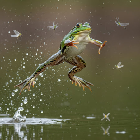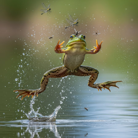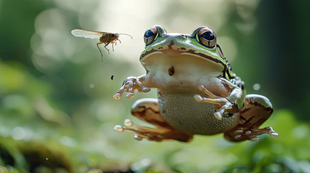 A captivating moment captured as a frog leaps into the air to catch an insect above a splashing surface. The scene highlights the dynamic action and agility of wildlife, showcasing the vibrant colors and natural beauty of the environment.