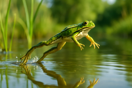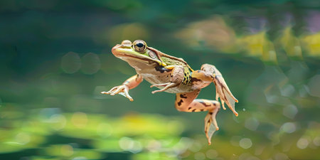 A frog leaps gracefully above the water in a vibrant green natural setting