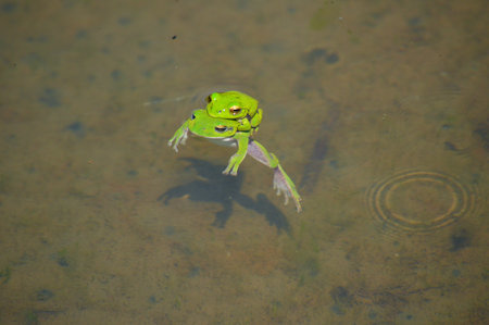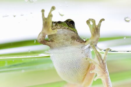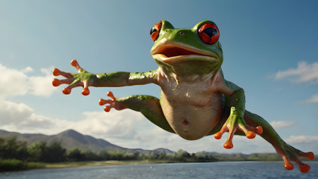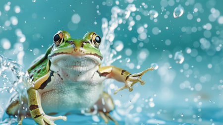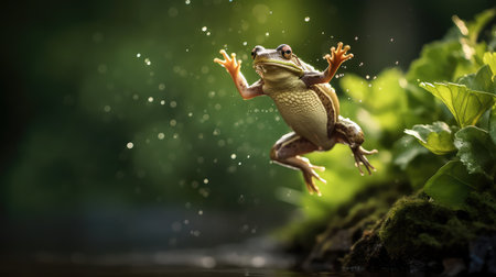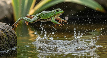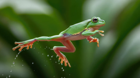 A vibrant green frog is captured mid-leap, showcasing its limbs and the water droplets. The image highlights the creature's colors, textures, and dynamic pose. The composition, set against a blurred green backdrop, suggests an outdoor natural environment. Suitable for editorial and commercial use, emphasizing nature.