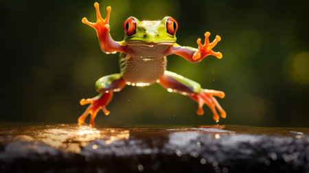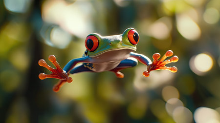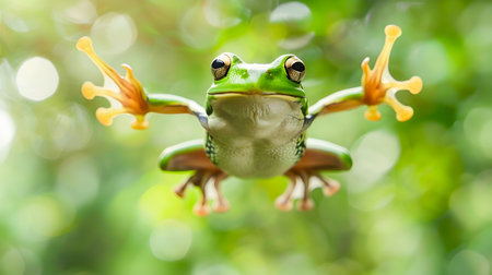 Vibrant Green Tree Frog Leaping Through the Air in Lush Tropical Forest Environment Showcasing the Unique Adaptations and Behaviors of This Fascinating Amphibian Species