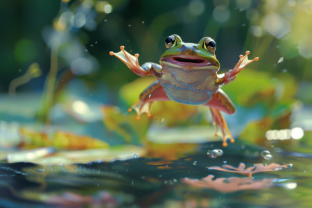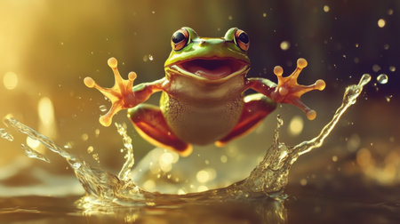 A vibrant frog leaps joyfully, creating a dynamic splash in the sunlit water, showcasing the beauty of wildlife and the energy of nature's playful moments.