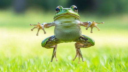 This image showcases a vibrant green frog in mid-jump, highlighting its dynamic movement against a soothing blurred backdrop of lush green grass. Ideal for nature themes.
