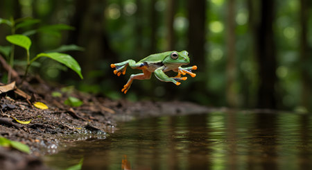 A vibrant green tree frog leaps gracefully over a calm pool of water in a lush, tropical forest setting. The frog's bright green coloring and orange-yellow feet are contrasted by the earthy tones of the forest floor and the dark, reflective water. Natural light illuminates the scene from the front, creating a lively and engaging image, suitable for use in educational or wildlife publications.