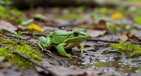 A green frog sits on the muddy edge of a small puddle on the forest floor. The low-angle shot highlights the wet texture of the frog's skin and the damp, natural surroundings.
