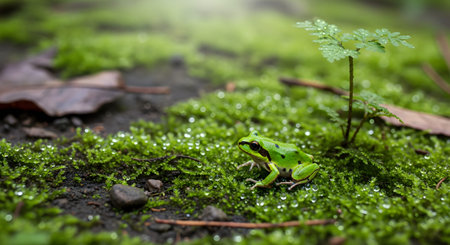 A tiny green frog sits on a lush mossy patch on the forest floor next to a small plant sprout. The macro shot highlights the miniature world of the rainforest ecosystem.