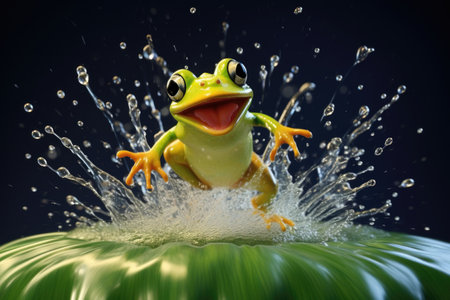frog on a lily pad with a raindrop splash, showcasing dynamic water movement