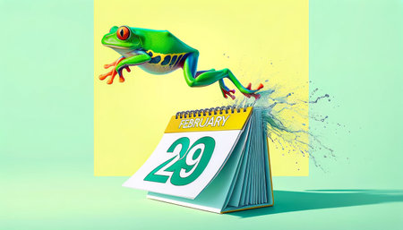 A vibrant frog leaping off a calendar marking Leap Day, February 29 Leap Year Concept