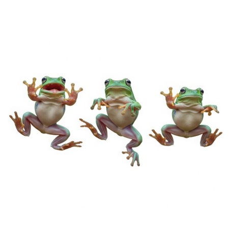 This image features three whimsical frog figurines in mid-jump, each with a playful expression. The frogs are brightly colored with shades of green, orange, and brown. They appear to be dancing or leaping with joy, adding a sense of liveliness and fun to the scene. The background is plain white, which highlights the vibrant colors and dynamic poses of the frogs.