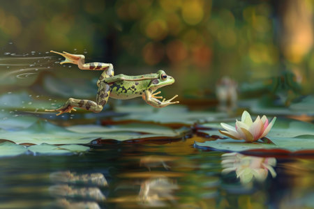 A vibrant green amphibian vaults gracefully over tranquil waters, surrounded by a gentle, out-of-focus nature scene illuminated by warm, shimmering bokeh effects.
