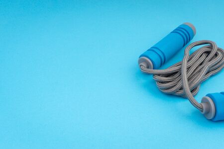 Skipping rope or jumping rope isolated on blue background. Selective focus and crop fragment