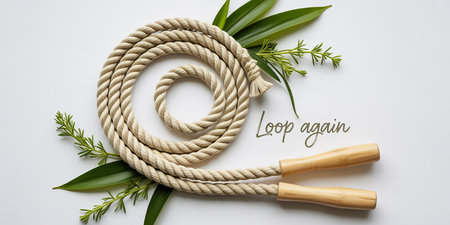 A jump rope coiled in a spiral with green leaves and the text loop again Clear details and vibrant colors en...