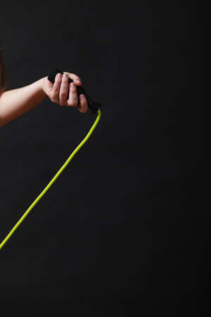 Woman spend actively free time. Female hand with jumping skipping rope on black background.