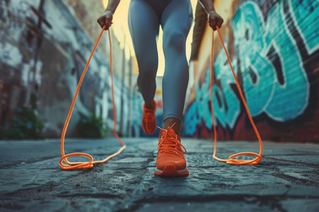 Woman wearing bright orange shoes jumping rope in an urban setting
