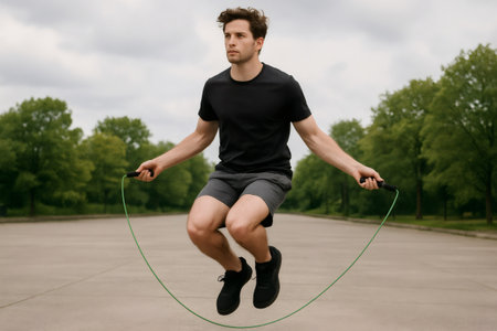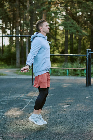Young sportsman exercising with jump rope outdoors, promoting healthy lifestyle and physical activity