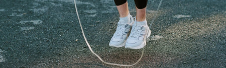 Website banner with young adult woman jumping rope outdoors, only lower legs and feet visible, wearing athletic shoes, exercising on asphalt surface, engaging in fitness activity