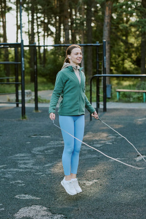 Young adult woman exercising outdoors, jumping rope in park, smiling and looking forward, surrounded by fitness equipment and trees, engaging in active healthy lifestyle