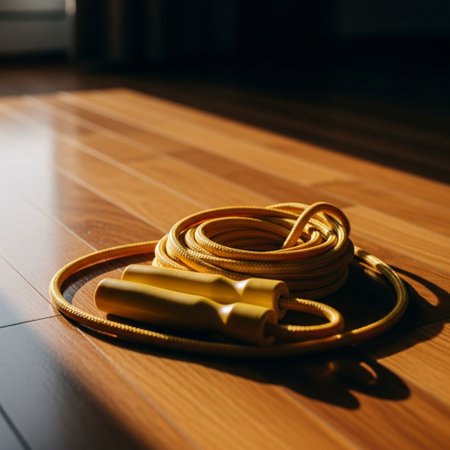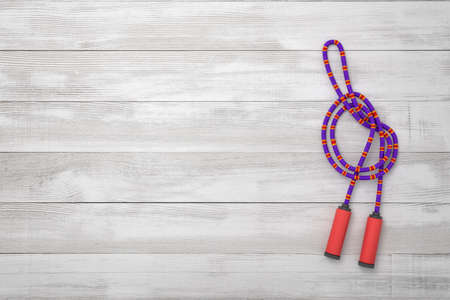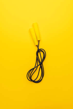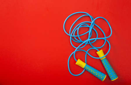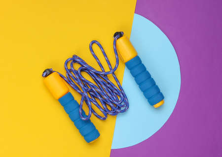 Skipping rope on colored background. Top view. Minimalistic sport concept.
