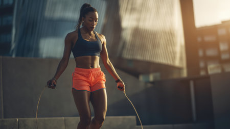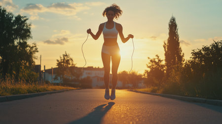 A person jumps with a rope against a bright sunset sky, capturing the essence of urban fitness and active lifestyle in a vibrant and energetic scene.