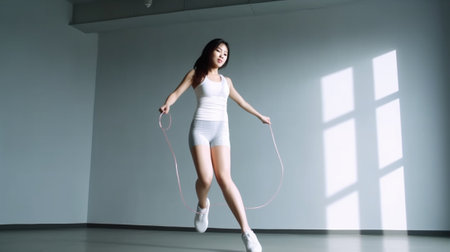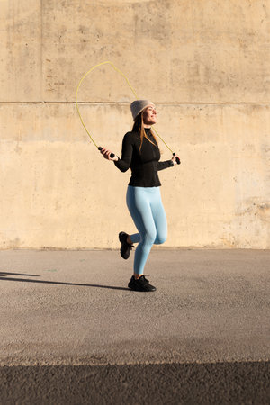 Generative AI : Full length of positive energetic slim female in sportive outfit jumping with skipping rope near wall