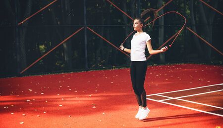 Sporty caucasian girl using a jump rope on a red tennis stadium in a sunny summer morning
