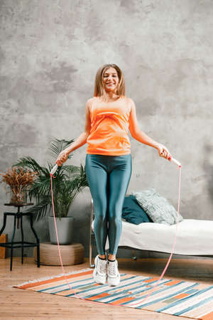 Young woman goes in for sports at home, training online. The athlete jumping rope, smiles, on background bed, vase, carpet