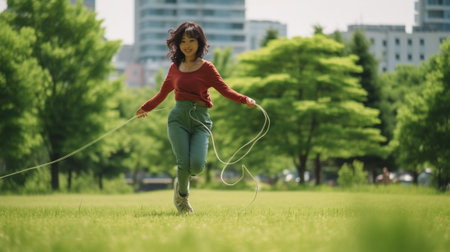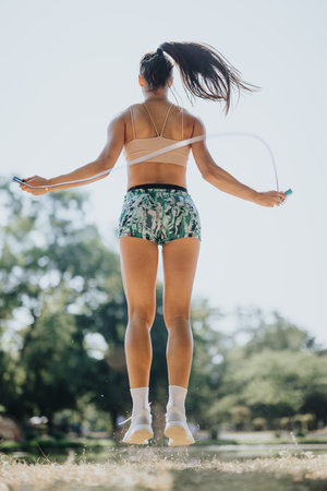 Generative AI : Full length of positive energetic slim female in sportive outfit jumping with skipping rope in sunny summer park