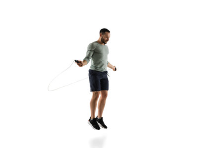 Jumping-rope. Young caucasian male model in action, motion on white background with copyspace. Concept of sport, movement, energy and dynamic, healthy lifestyle. Training, practicing. Authentic.