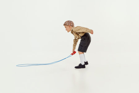 Little boy, child in classical retro clothes playing with jumping rope over grey studio background. Concept of game, childhood, friendship