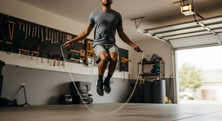 A man in sportswear is in mid-air while jumping rope inside a home garage. The garage is organized with tools on a pegboard in the background, representing a home workout, fitness, and exercise.
