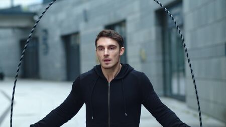 Fitness man jumping on skip rope in slow motion. Closeup sportsman using jump rope on workout outdoor at urban space. Male athlete training cardio exercise in slow motion.