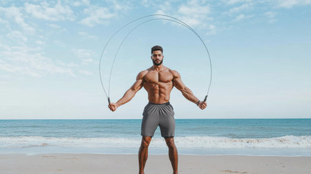 A muscular man skips rope on a beautiful beach, thoroughly enjoying his fitness routine and the breathtaking ocean view