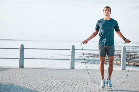 Skipping rope, mockup and man training by the beach for his outdoor morning exercise, workout and fitness routine. Athlete, cardio and male jump by the ocean or sea for wellness lifestyle