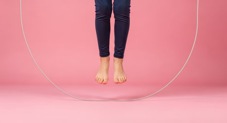 Young girl in purple hoodie jumping rope against vibrant pink background showcasing fitness and an active lifestyle