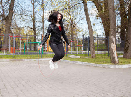 young brunette girl in black jacket and jeans jumping rope outdoor on sunny spring day