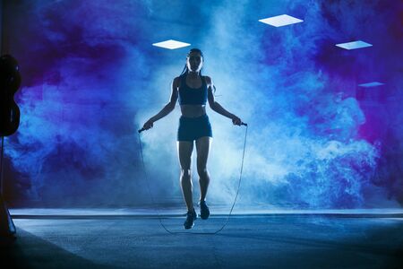 Front view of pretty female bodybuilder in sport suit with perfect body using skipping rope in gym. Young athletic woman jumping in hall, dark atmosphere with smoke and backlit. Concept of sport.