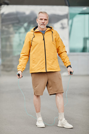 Vertical full length portrait of handsome mature man exercising outdoors with skipping rope amd looking at camera