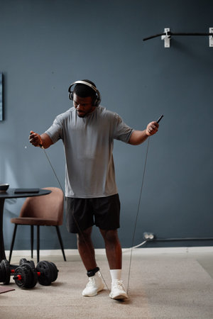 Black young adult man wearing ankle monitor standing indoors listening to headphones holding jump rope, preparing for workout with dumbbells on floor suggesting house arrest context