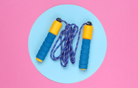 Skipping rope on pink background with blue pastel circle in the middle. Top view. Minimalistic sport concept.