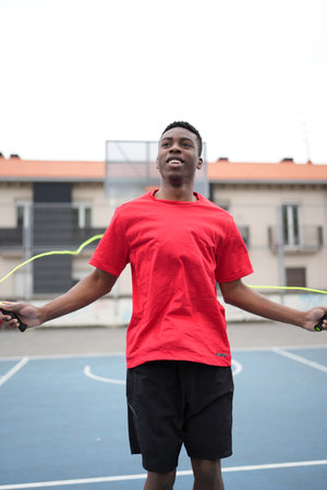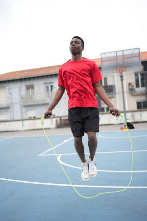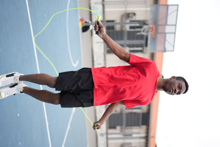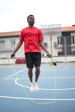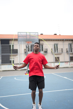Vertical photo of an African young man jumping rope in an urban outdoor basketball court