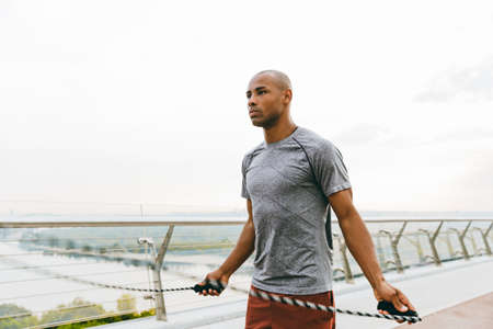 Handsome african sports man in sports uniform warming up, jumping with a rope