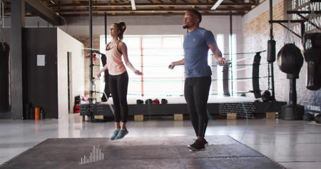 Jumping fitness duo synchronizing rope jumps in fitness studio, with punching bags and kettlebells. Athletes, workout, dynamic, industrial, fitness, strength, training