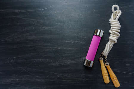 Fitness equity (drumbell, skip/jump rope) on wooden background