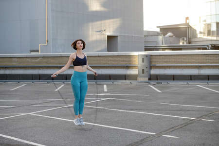 Full length of beautiful young woman in sports clothing using jumping rope on patio : Generative AI