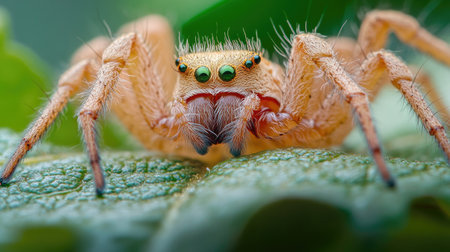 A striking close-up of a spider showcasing its vibrant green eyes resting on a green leaf. The intricate details of its fur and features are highlighted, perfect for nature enthusiasts.